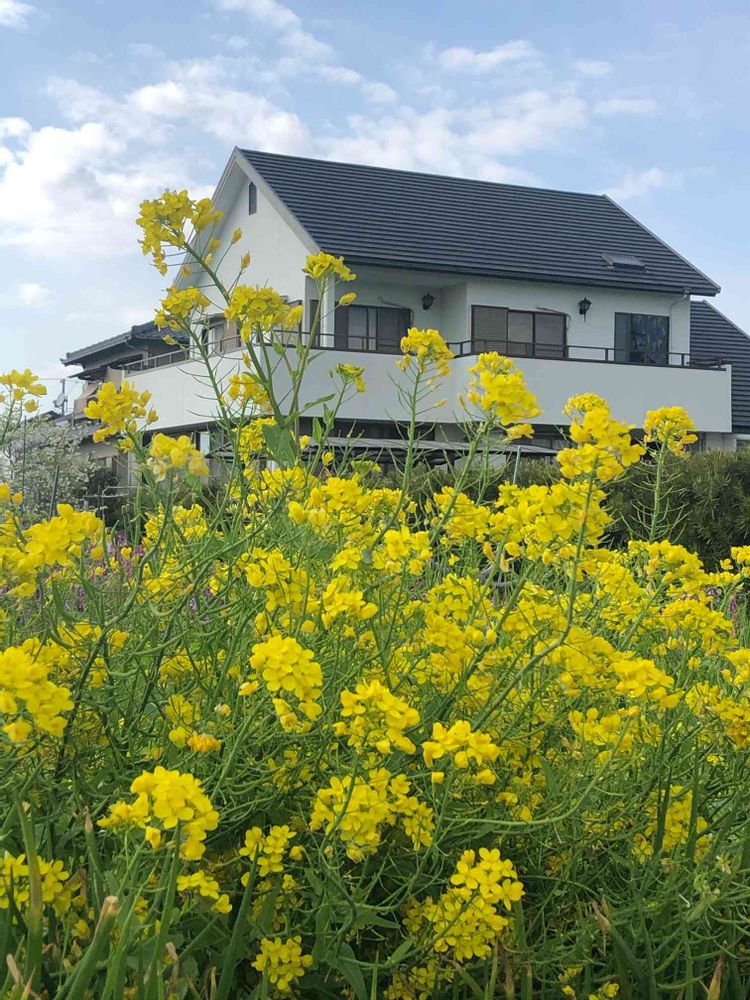まるで一面の菜の花畑の向こうに浮かんでいるような白い家