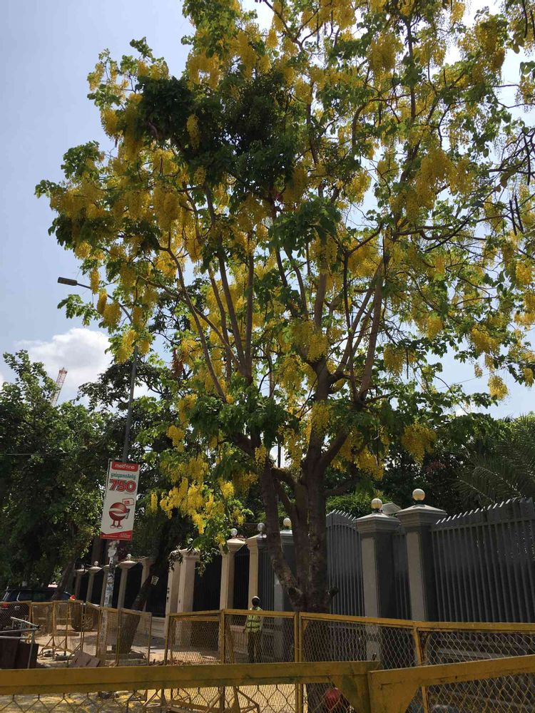カンボジア国 プノンペン市内の道路際の木一面に咲いた黄色の花です。