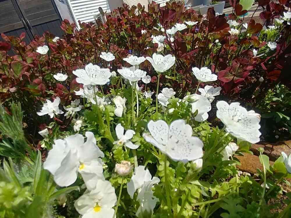 お花も元気😊零れ種を移植したネモフィラ🌻後ろのクローバーに負けない元気良さ❣