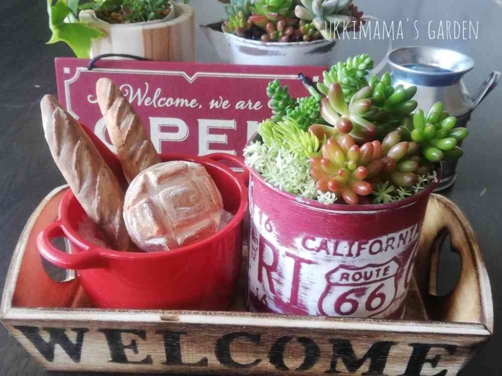 多肉の寄せ植えと木粉粘土で作ったパンを添えました〜🥖🥐🌿💕
