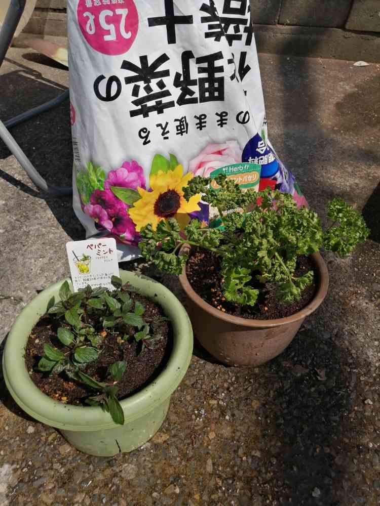 今日はお天気が良いからペパーミントとパラマウントパセリを鉢植えしました😃