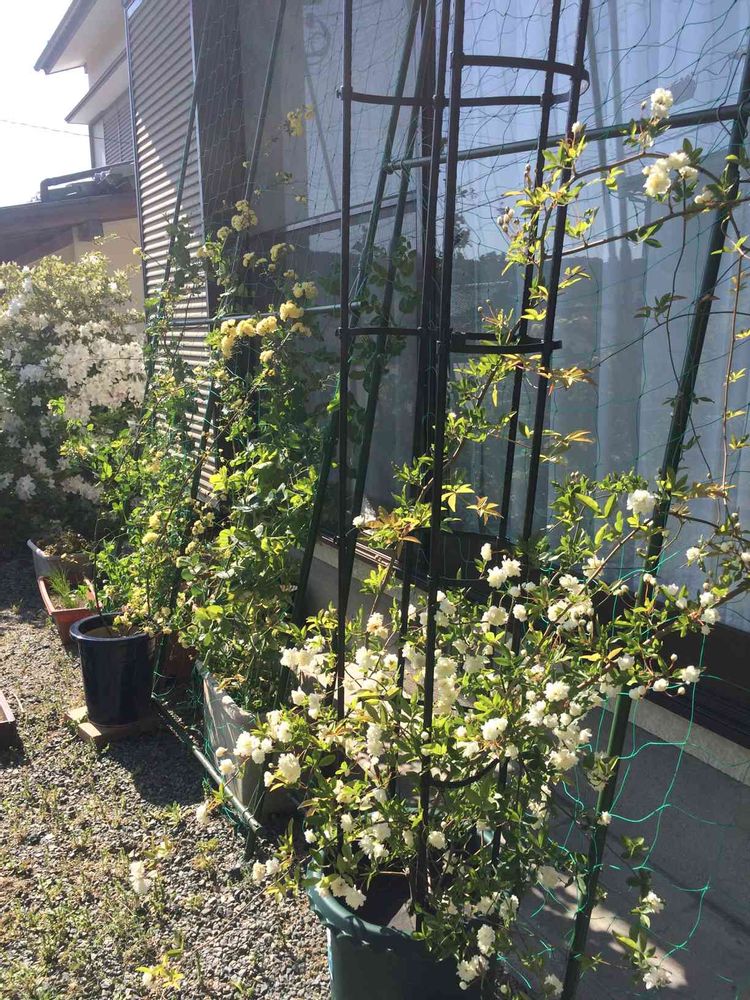 家に帰ると少しがっかりな白と黄色のモッコウバラ。花は綺麗ですけど、仕立て方がわかりません。朝顔用のネットにただもたれ掛けさせています。鉢植え3年目。