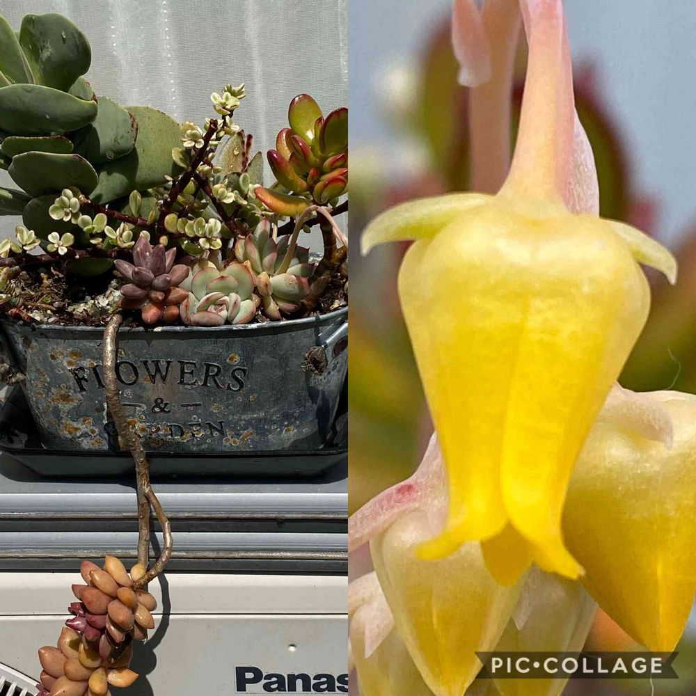 多肉の寄せ植えの一つエケベリアに黄色の釣鐘タイプの花🌼が咲きました💛