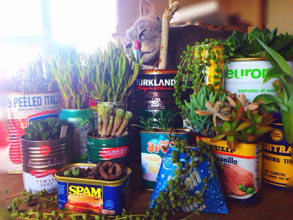 直印刷してある缶をそのまま使い多肉を植えています。