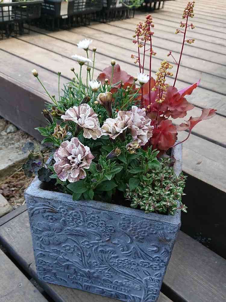 大人気のローラアシュレイのファイバークレイポットに寄せ植えさせて頂きました。