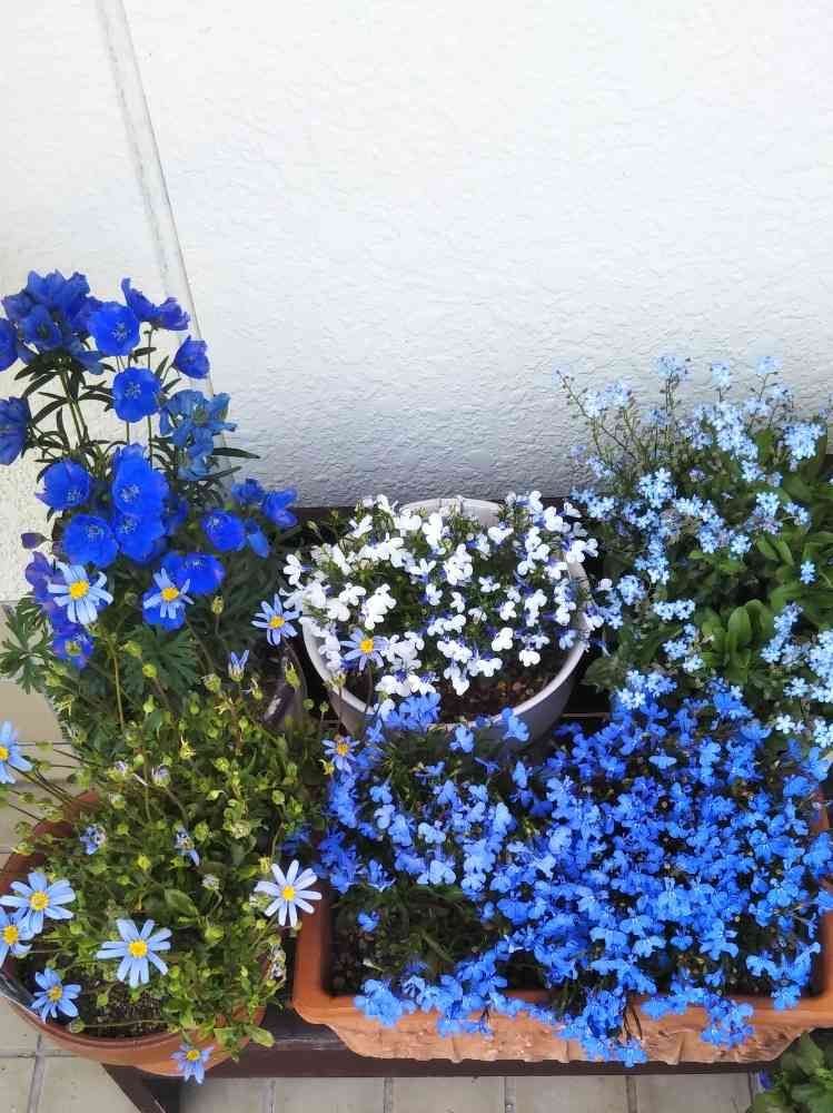 デルフィニウムブルー ロベリアブルーフラッシュ ワスレナグサモナミブルー 手前が ブルーデイジーアズールブルー ロベリアです