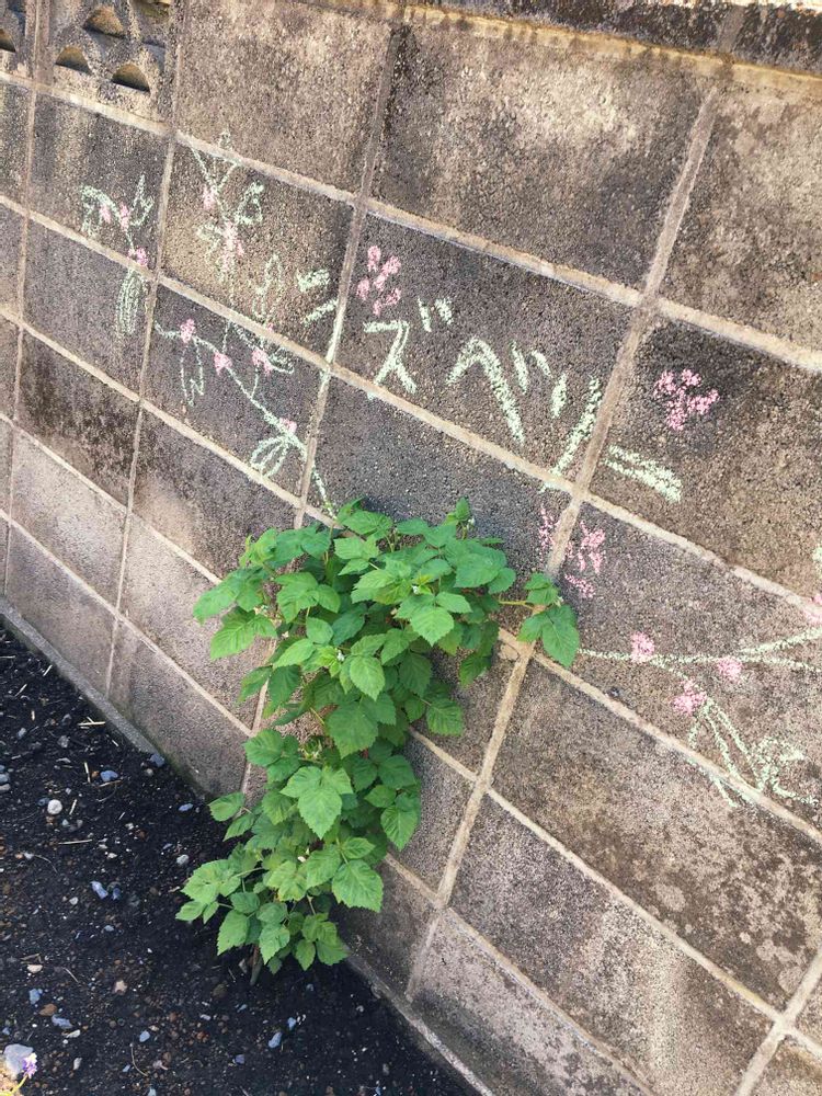 今月初めに植え付けたラズベリー。豊作を願って娘と落書き。