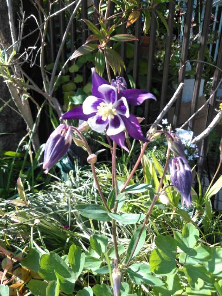 こぼれ種から生えてきた紫色の西洋オダマキ。周りの元ハクリュウ(先祖帰りして、みんな葉が緑になってしまったもの。)に守られる形で宿根草になっています。ピンクもありますが、紫色の方が好きかも・・・