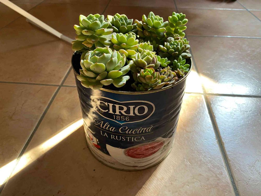 旦那がお昼に使った2.5リットルの超巨大トマト缶を使って寄せ植え…というかぶっこみ鉢を空けるために移動😊