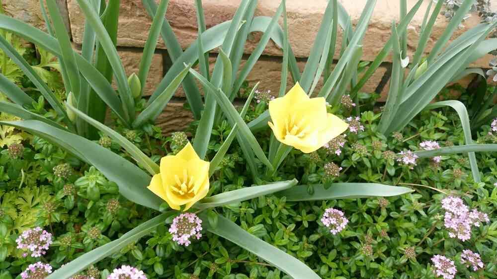 こちらにも黄色いチューリップ❤✨ 下のピンクのお花はタイムかな!?