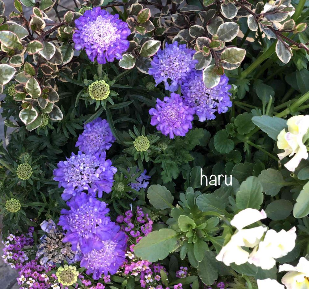 去年の秋にビオラと寄植えにしてたスカビオサがやっと咲いてきました〜
