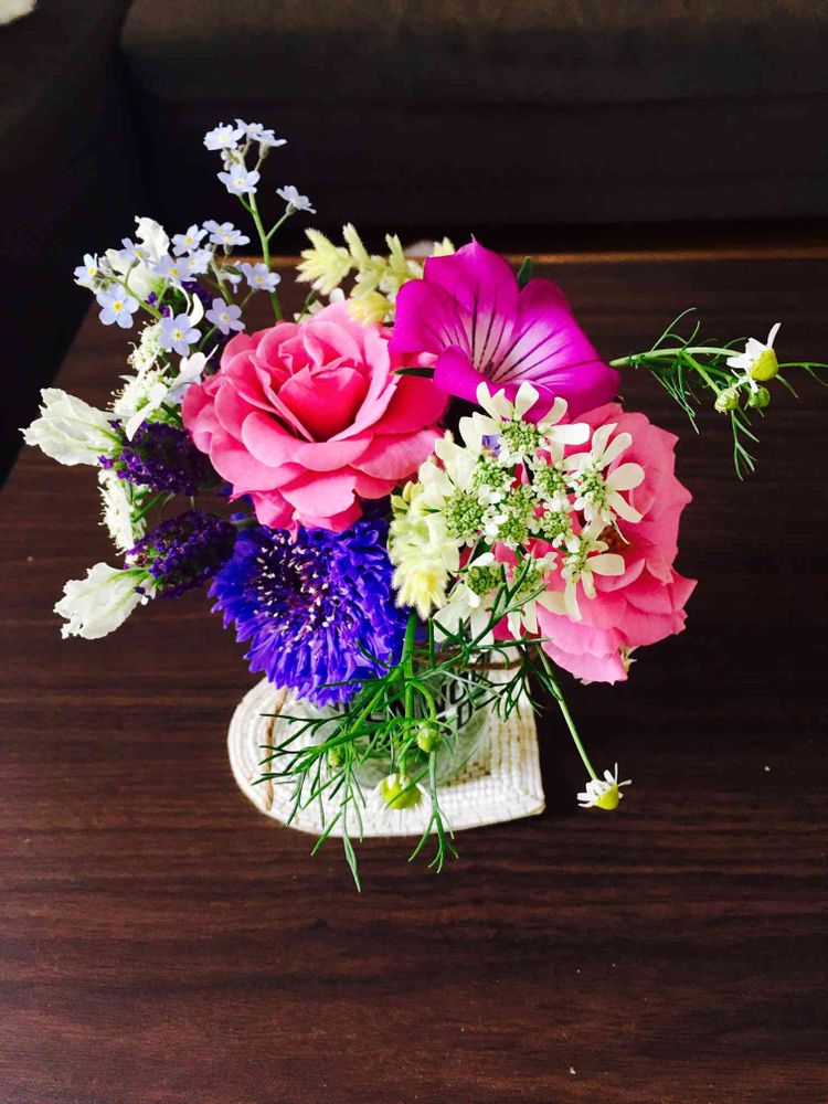 庭に咲いてる花をカットして瓶に入れて…