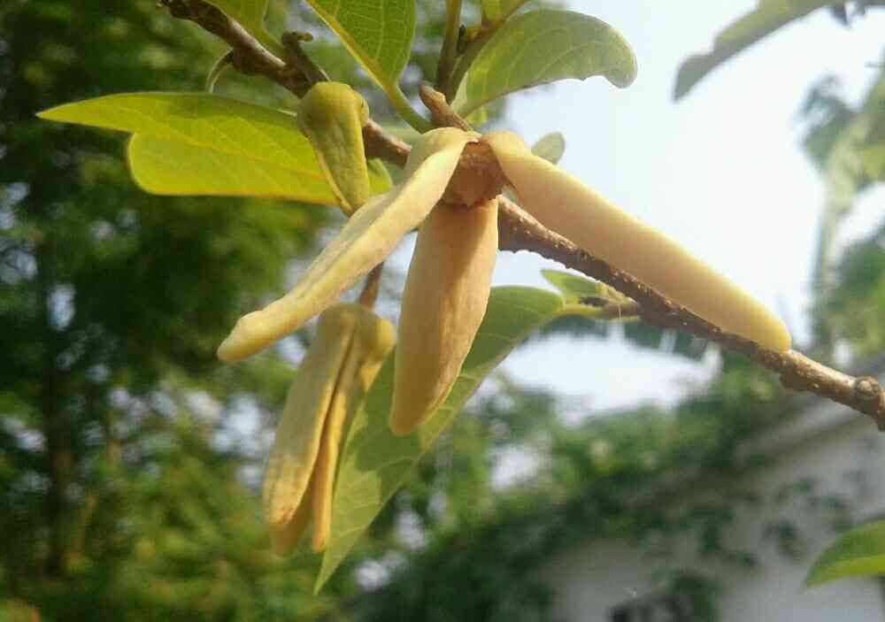 バンレイシ(釈迦頭、英語でシュガーアップル)のシーデーン(赤実)種が開花中です。普通のバンレイシの花は黄緑〜黄色ですが、シーデーンはややピンクになる様です。