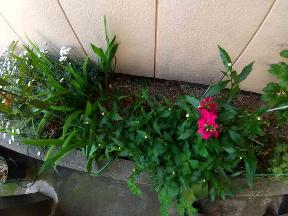 カーポート屋根下になり☀️が届かない😥😥赤はストック🌼ミヤコワスレに小さな蕾、見えない位😂😂🤗