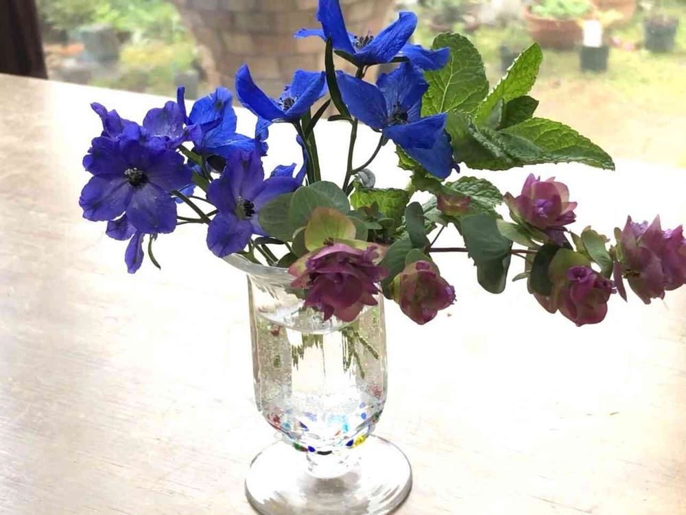 雨上がりに庭から摘んで来て、なんとなく眺めていたらデルフィニウムのブルー、紫から目が離れなくなりました。