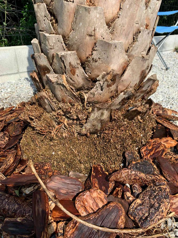 ナツメヤシの根本がこのような状態ですが、朽ちているのかそれとも根っこが出ているのかどちらでしょうか?