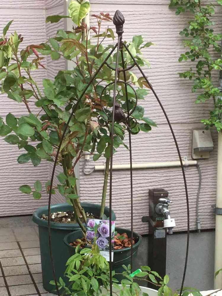 木香薔薇大きくなるので、オベリスクを大きく超えて育つかと思いメルガーデンさんにきいたら、鉢の大きさ以上にはならないから大丈夫ですよと言われたので鉢も一緒に二つ買いました。