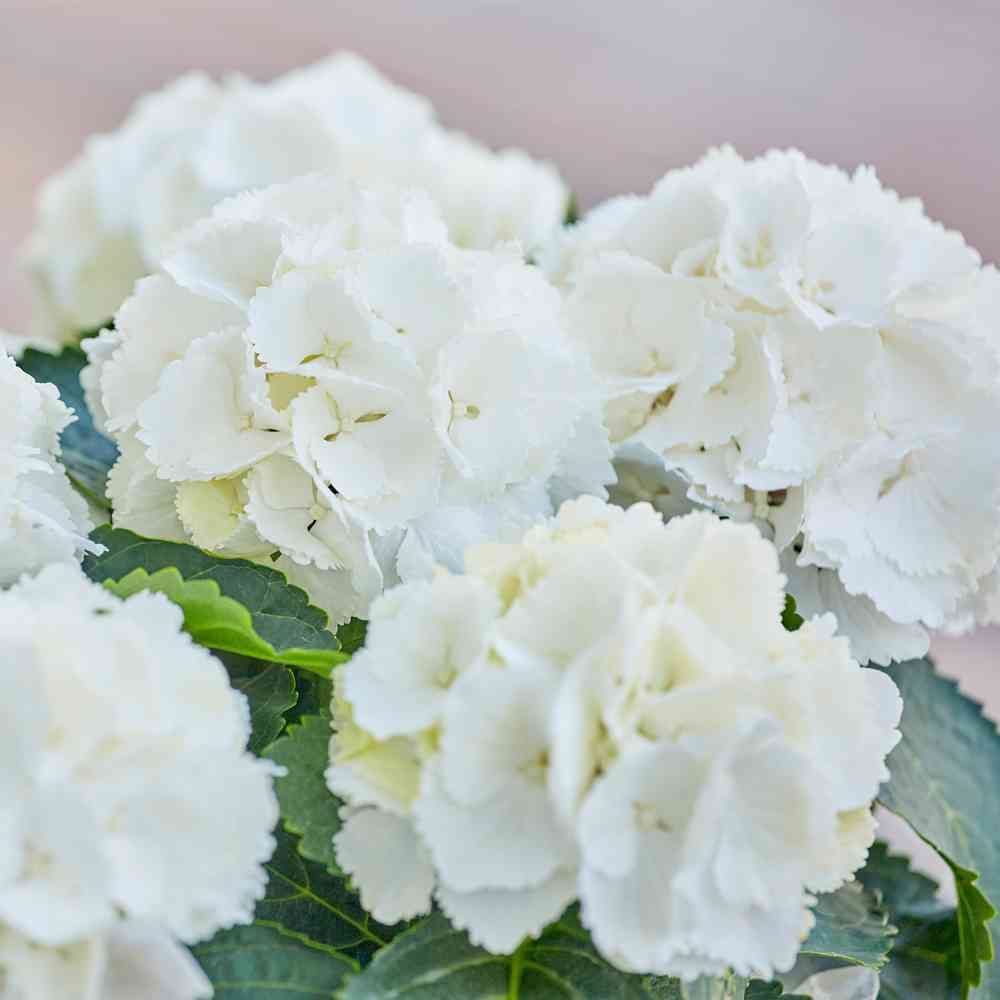 雪のように真っ白なあじさい。「アイスベアー(しろくまあじさい)」という品種で、花びらのフチに細かな切れ込みが入っているのが特徴です。エレガントで繊細な雰囲気は、白いあじさいの花言葉「寛容、広くて優しい心」にぴったり。