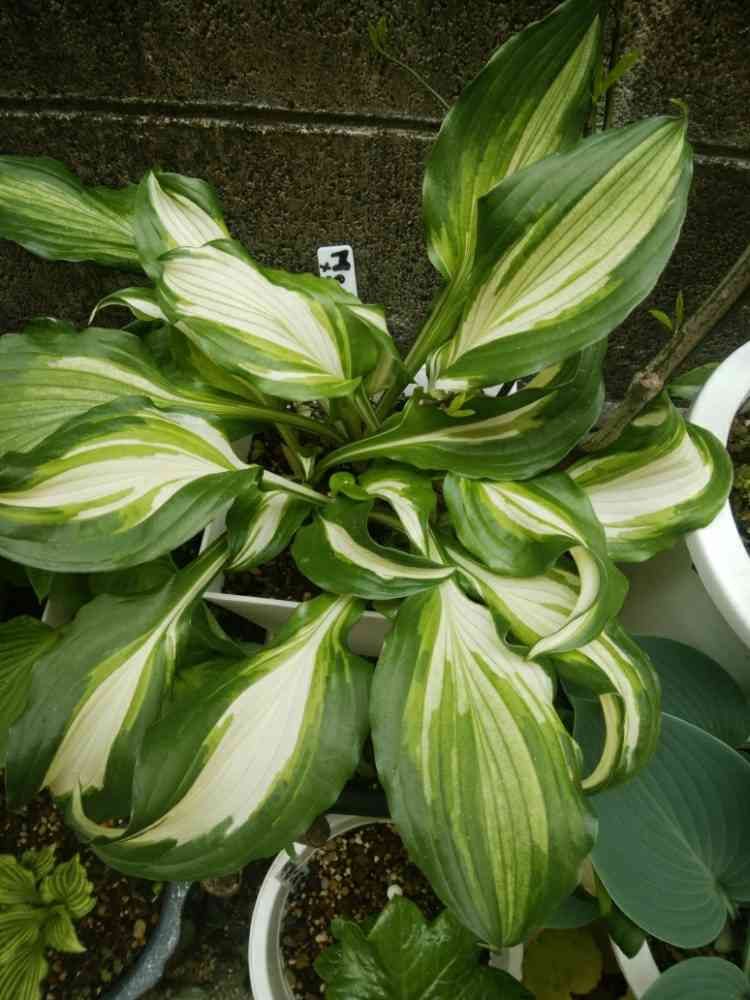 ギボウシ メディオパリエガータ。ウンジュラータ メディオパリエガータ。うねった、中斑、斑入りって意味。ウンジュラータだったりパリエガータだったり色んな名前で出回ってますね。斑の入りも色々で濃いめ緑や中斑がスプレーだったり、時々先祖帰りして緑葉になるのもあります。