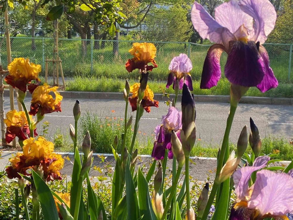 お出かけ先,ジャーマンアイリス紫と黄色,2020春のガーデニングの投稿画像