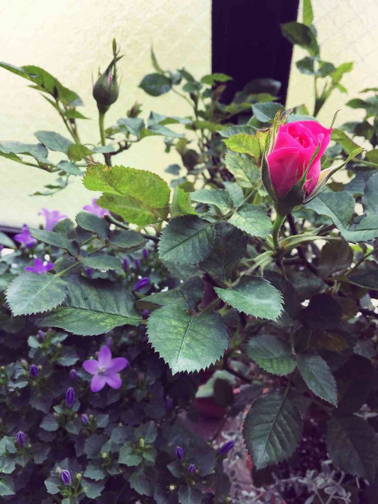 そろそろ咲きそうなショッキングピンクのミニバラ。もうすぐです。待ってますよ〜。