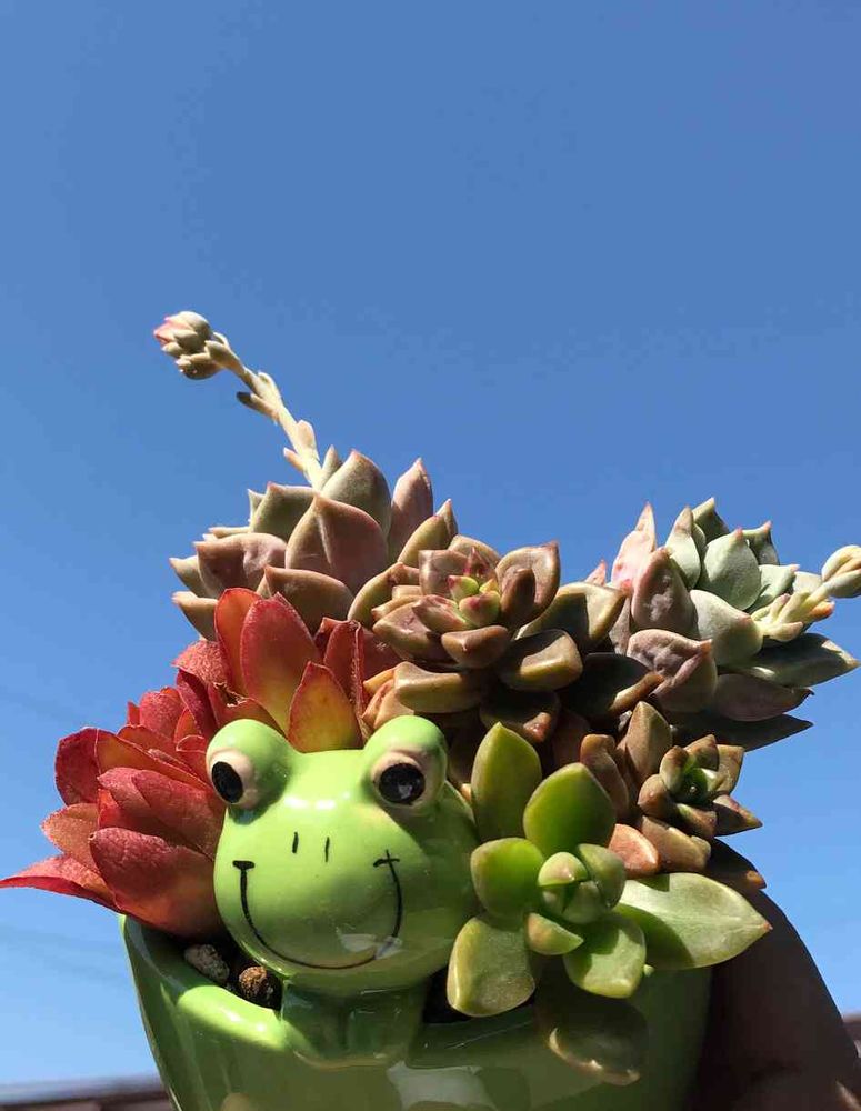 真っ青な背景❣️気持ちの良い天気ですね〜❣️ケロンパさんも気持ち良さそう❣️
