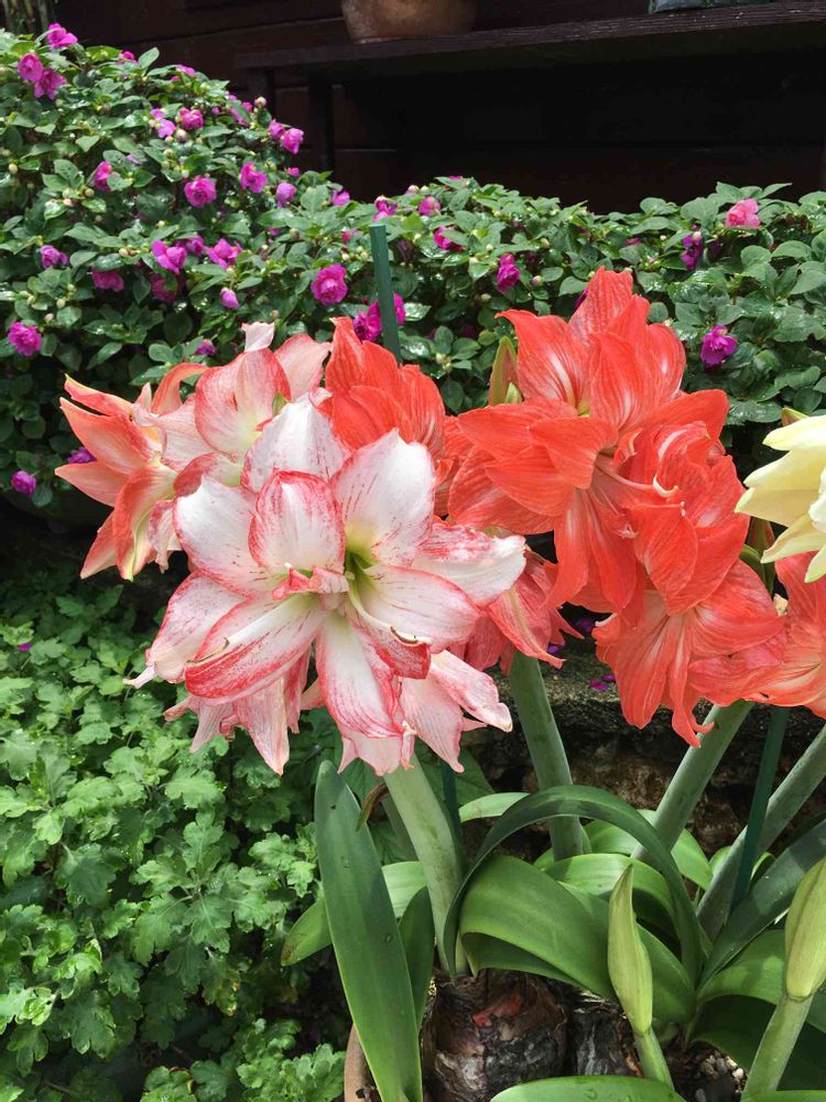 アマリリスはお部屋の中で育てるイメージでしたが、沖縄では、街路樹の足もとに植えられているのを、よく見かけます。