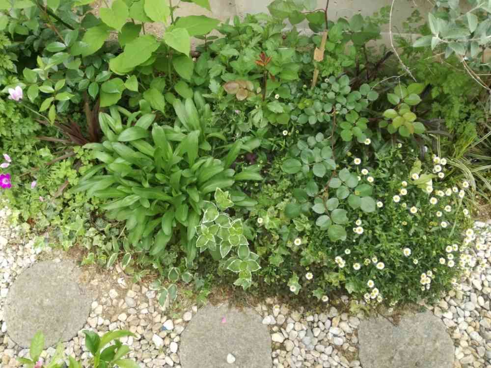 丸い踏み石に沿って生えている草花が青々としていていいですね!