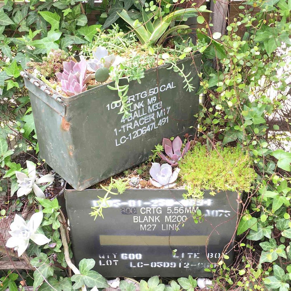 ウッドデッキにある、弾薬箱が放置しすぎの荒野のミリタリーZONEになってたので、多肉ちゃん達を植え替えてアレンジし直しました😊