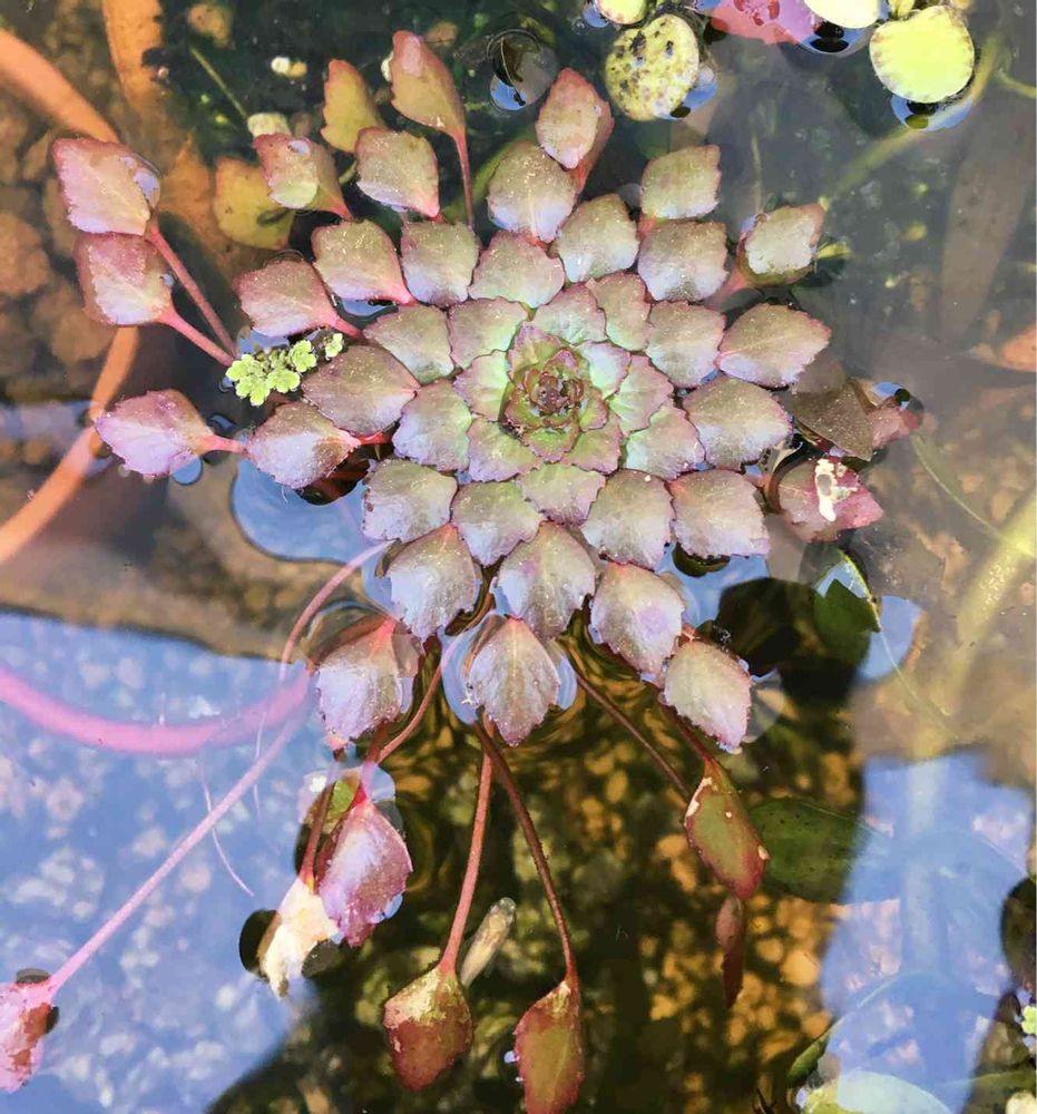 ウォーターダイヤ。浮き草としてパックに入れられホームセンターで売られていたけど調べてみたらパックに書いてある方法では枯れて無くなるらしく😅水に浮かせるだけでは消滅するそうで小さい鉢に赤玉土入れて茎の先を植えました。