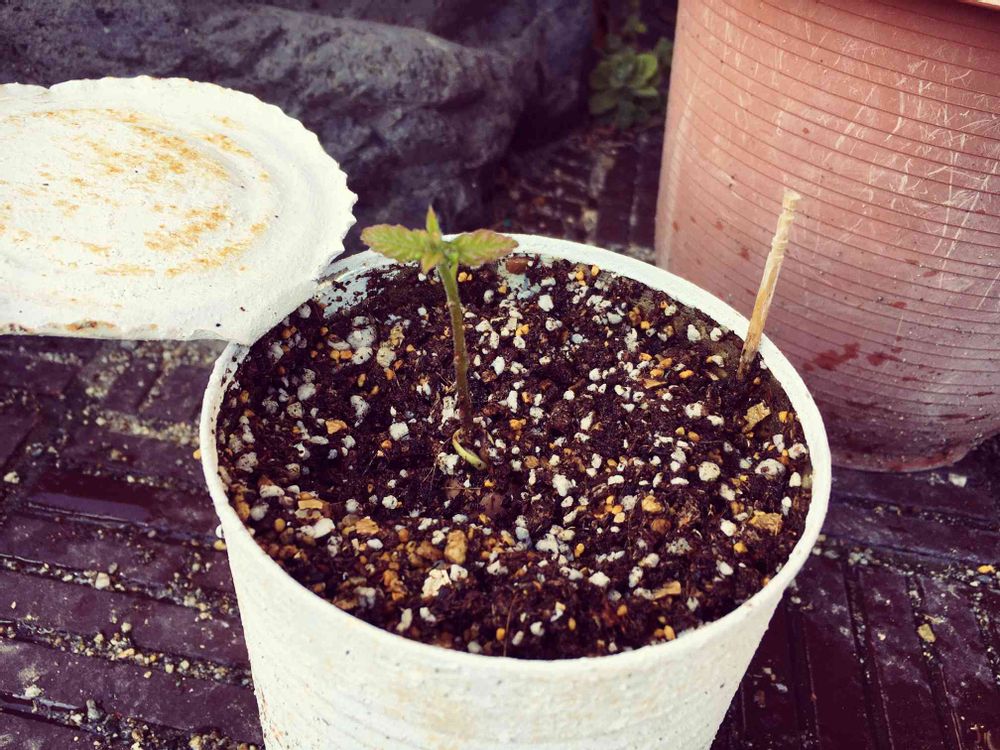 去年おちびと拾ったどんぐりから芽が出たので植えました😀