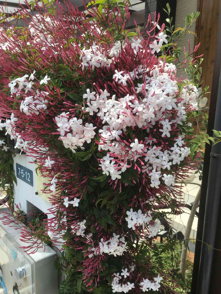 散歩中見つけた羽衣ジャスミン。白い花が綺麗にいっぱい咲いてました。