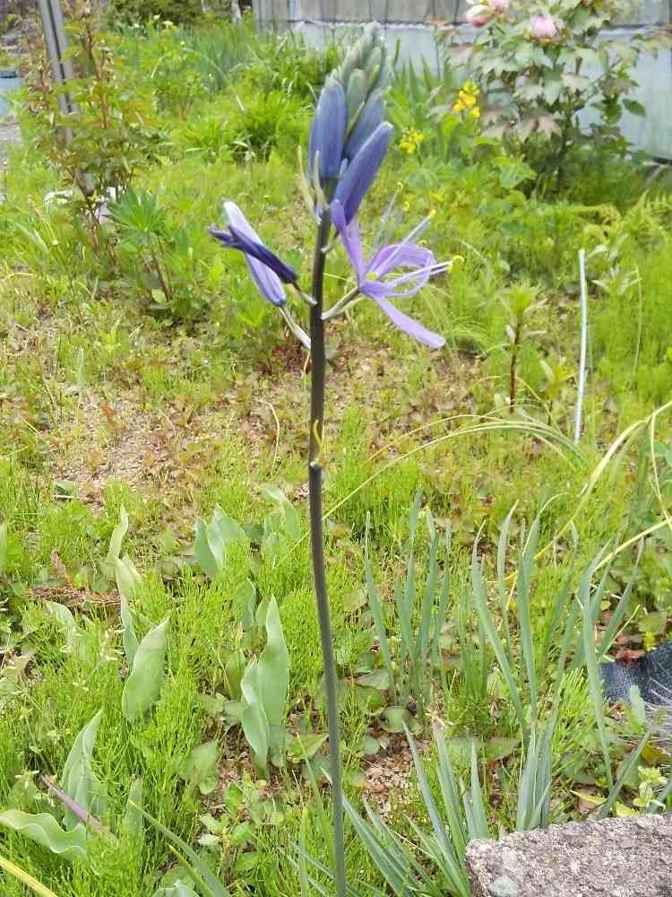 球根?細い葉が、茎を中心に土から放射状に出ています。