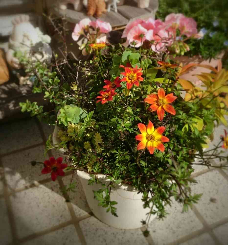 ビデンス ビーダンスメインの寄せ植えです。このレッドは少し花首が長めで弱這性だそうです。甘い香りで蜜蜂が寄ってくるそうで、これからが楽しみです!
