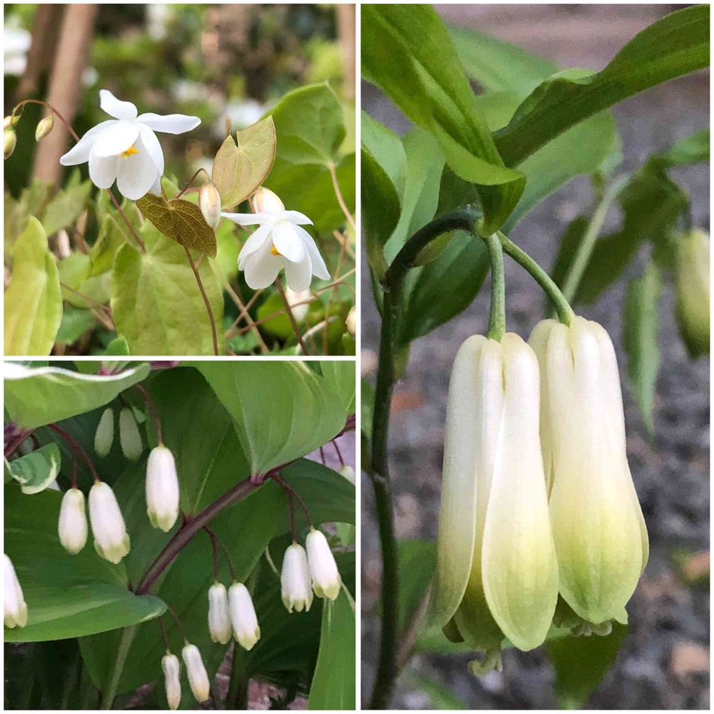 左上から、バイカイカリソウ、斑入りアマドコロ(去年名前を教えていただきました。)、右はホウチャクソウ