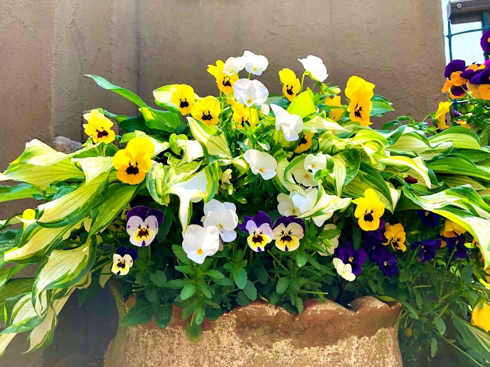 冬の間は寂しいギボウシの鉢、ビオラとパンジーを寄せ植えしてたら、4月に入ってニョキニョキ⤴️⤴️