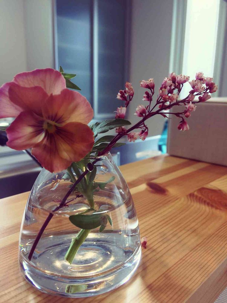 ヒューケラファイヤーチーフさんのお花が折れてしまった💦のでビオラさんと花瓶に🌸