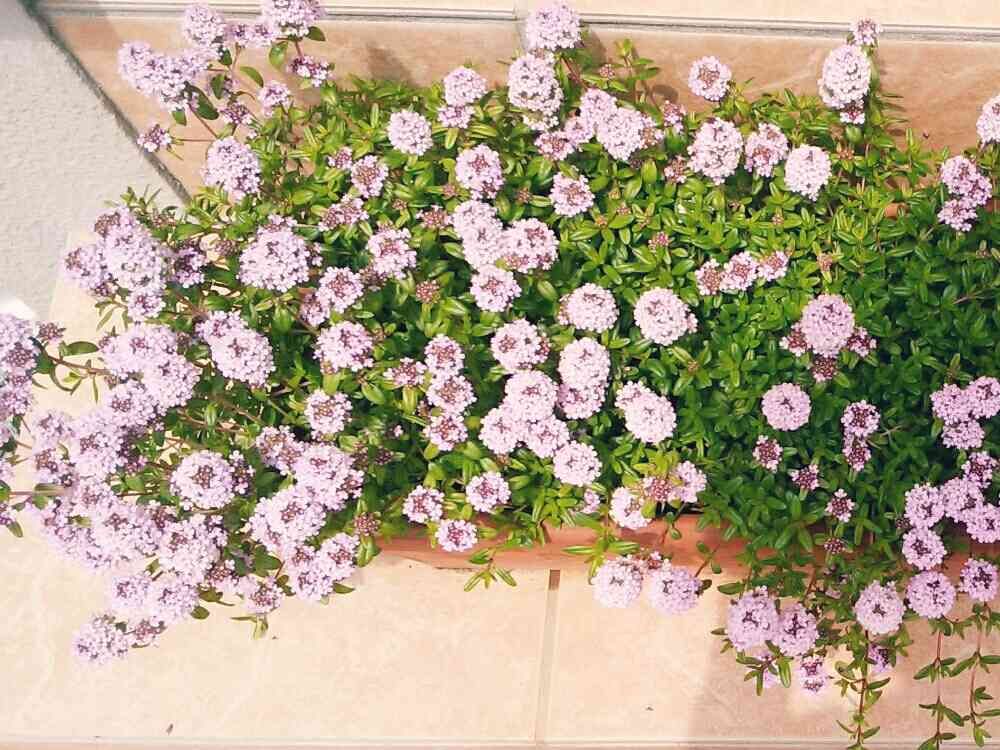 去年の秋に植え付けて鉢いっぱいに咲きました🌼👏タイムの花は今日も元気いっぱい👑