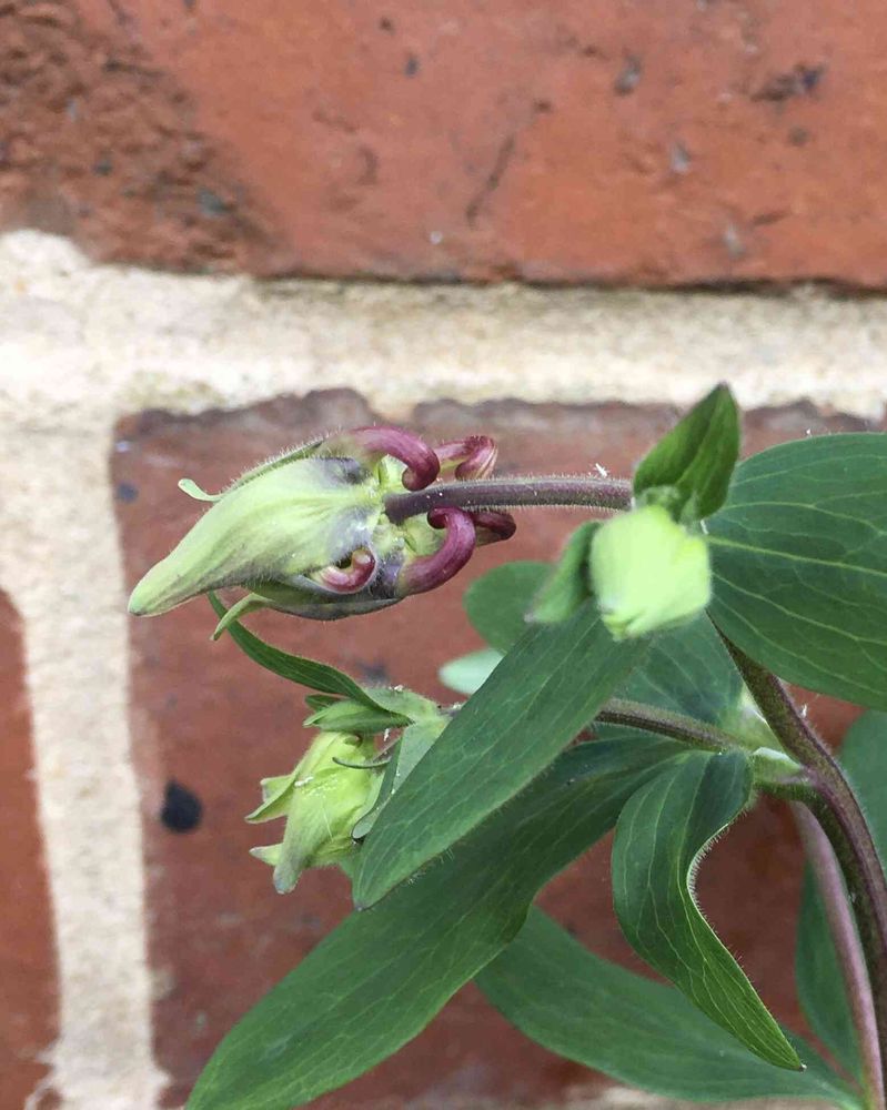 私の初めてのオダマキの蕾、ドラゴン🐉の頭の様な不思議な形‼️😆