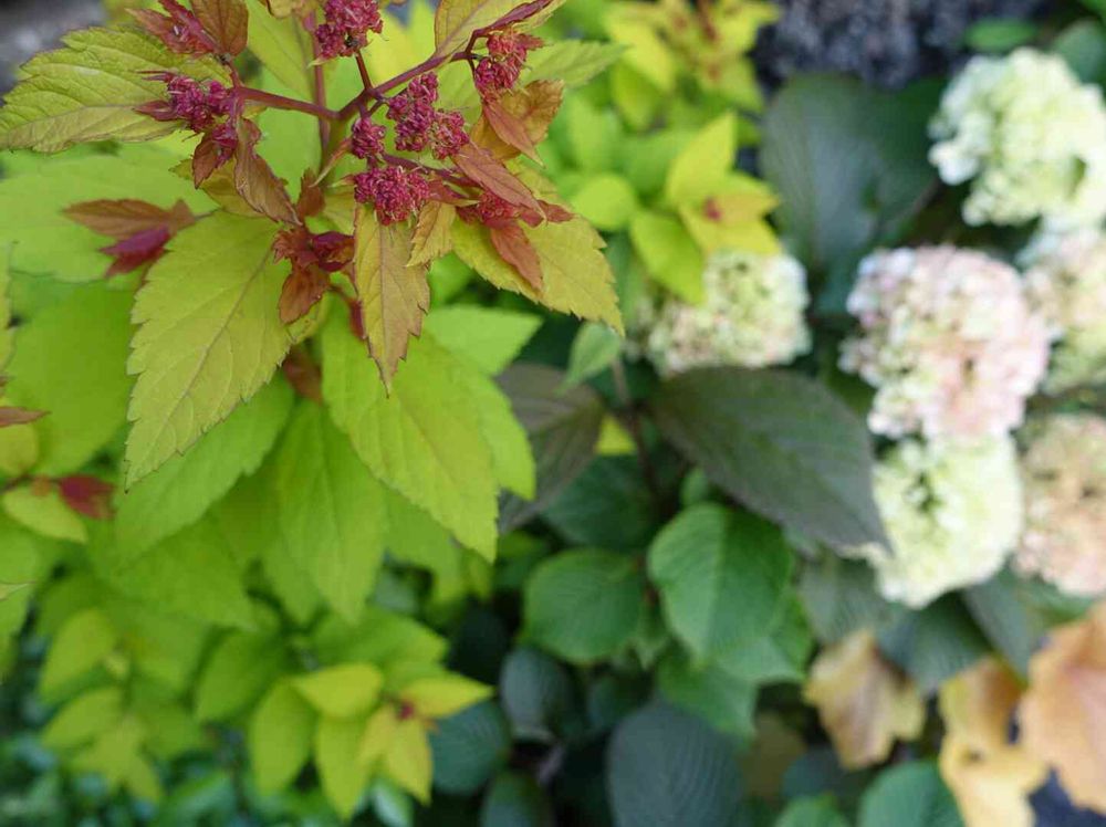 シモツケのお花が咲いてきました。オオデマリジェミニとヒューケラのオレンジにシモツケの赤がアクセントです。