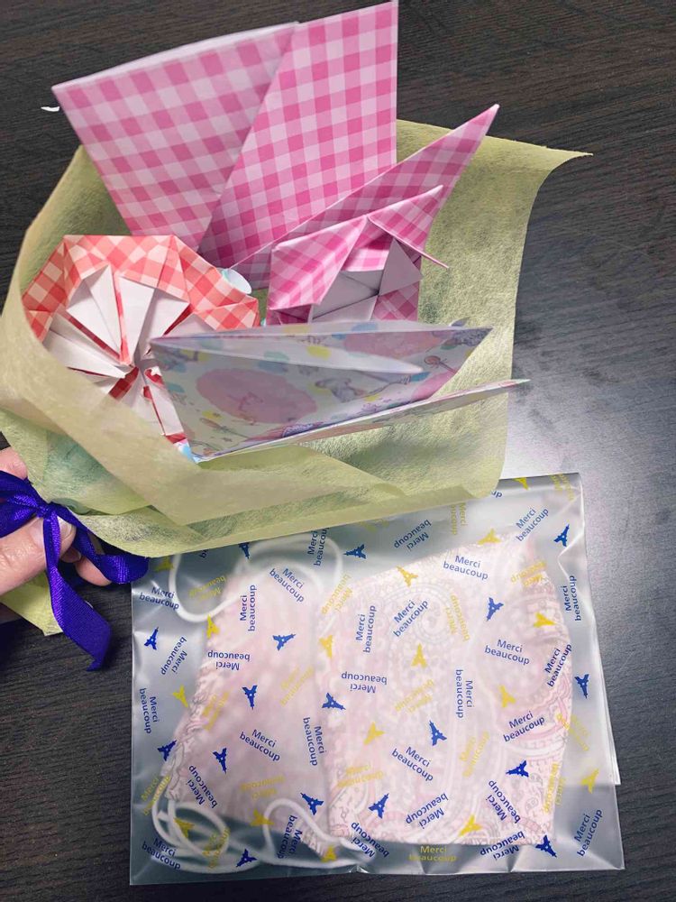 手作りマスク。子供も仲良くさせて貰っているので折り紙でチューリップ、バラ、ダリアを折って花束にしました。