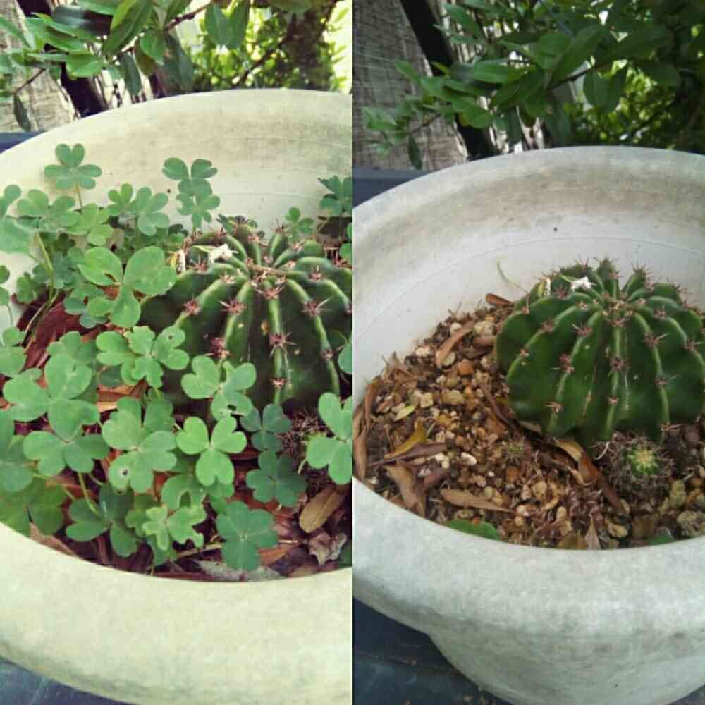 クローバーかなと思っていましたが、このGSでカタバミという雑草だと指摘されしたので早速退治した所、サボテンの子供がいました(笑)