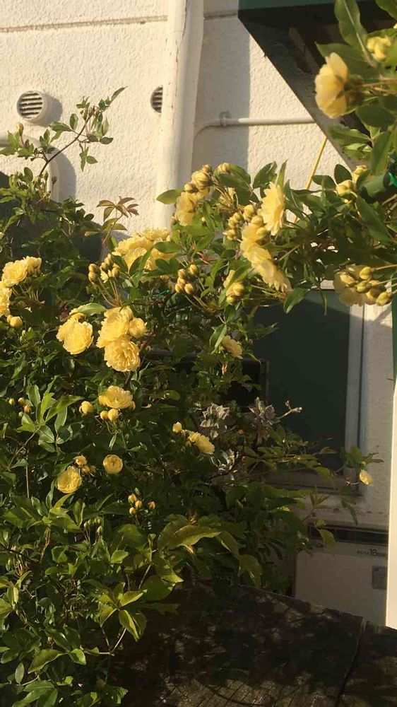 やっと我が家の木香薔薇さまが咲きました〜‼️3、4年前に小さな苗を頂いて…