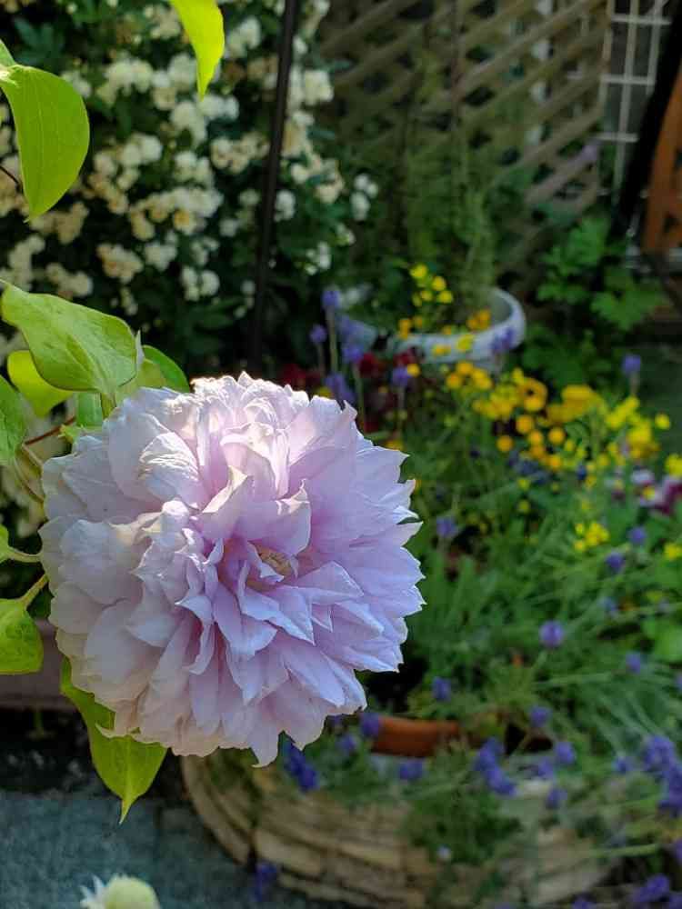 八重のクレマチスの後ろで白モッコウバラが満開🎵