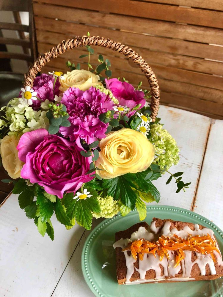 熱海市のカフェkinowaさんとの母の日限定コラボ商品。オーガニック栽培で育てられた熱海産の橙(だいだい)を使ったパウンドケーキと当店のフラワーアレンジメントのセット商品。宅急便でも配送可能です。