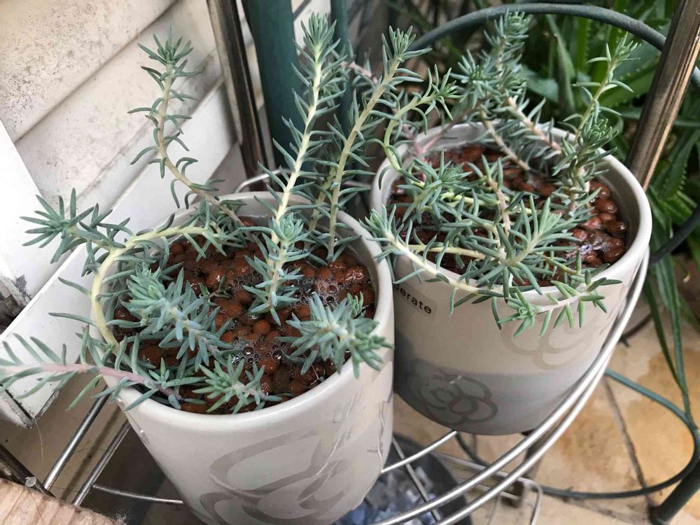 セダムが伸びたので、挿し穂の水耕栽培にチャレンジ。伸びた枝にヒゲが見られたら水を欲しがっている証拠。