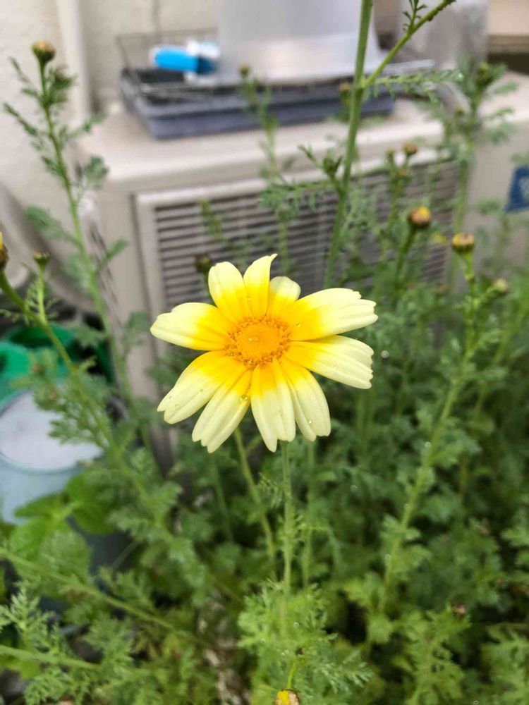 真っ黄色の春菊の花の隣に、薄黄色の春菊の花も咲きました。