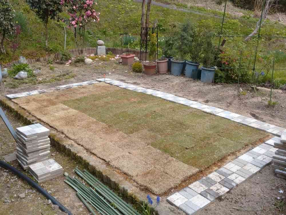 7縛りで2m×3mを敷き、残しておいた目土を芝の上から撒きホウキではき、最後に水をたっぷりと.