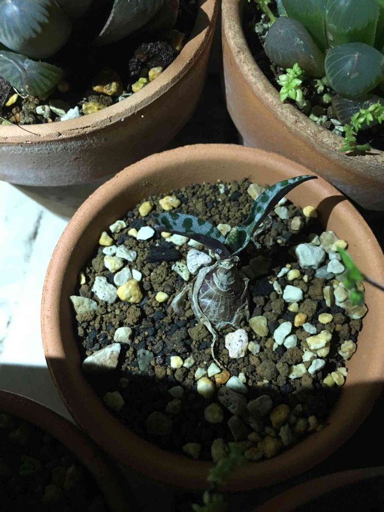 冬に買って冬に株分けした豹紋が花芽をつけてくれました。こんなに小さくて葉っぱも一つしかないのに懸命に見える所が可愛らしいです☺️