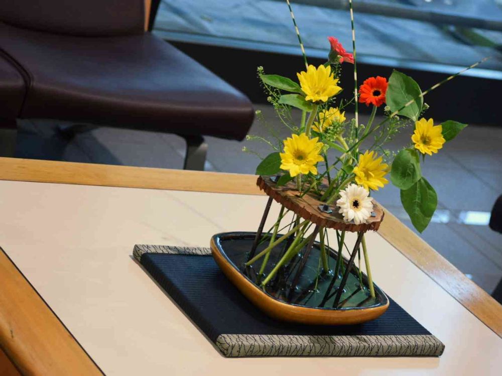4方向のイスがある為 どこの角度に座られても 花と目が合うように生けてみました。